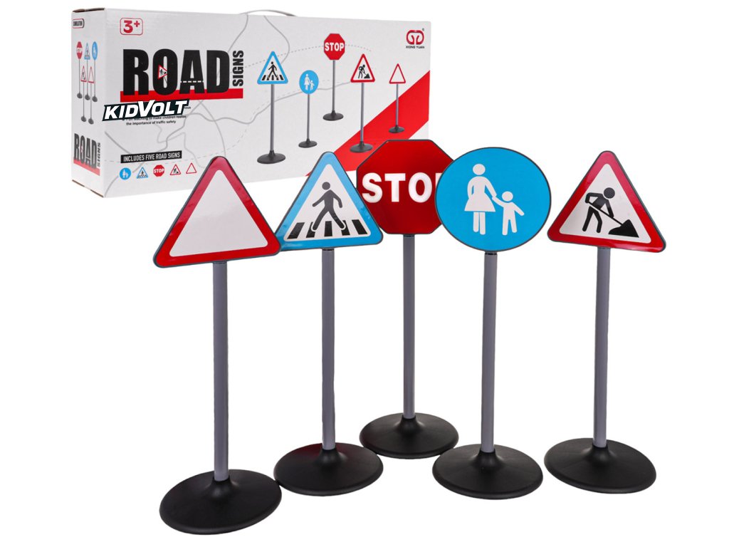 Sada obsahuje různé dopravní značky, jako jsou stop, přechod pro chodce, zákaz vjezdu, směr jízdy, a mnoho dalších, které dětem pomohou porozumět pravidlům silničního provozu a bezpečného chování na silnici.