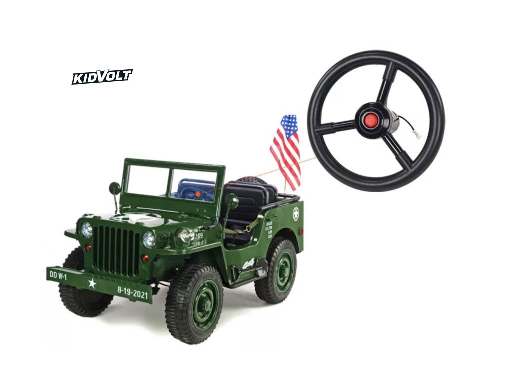 Náhradní volant je určený pro dětské elektrické autíčko džíp Willys 24V. Volant je možné nasadit na osu o průměru 10 mm.